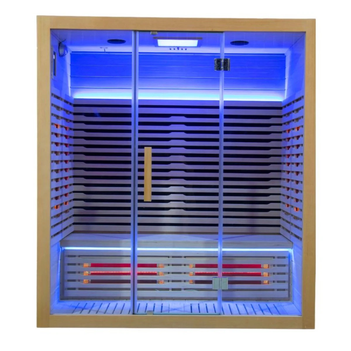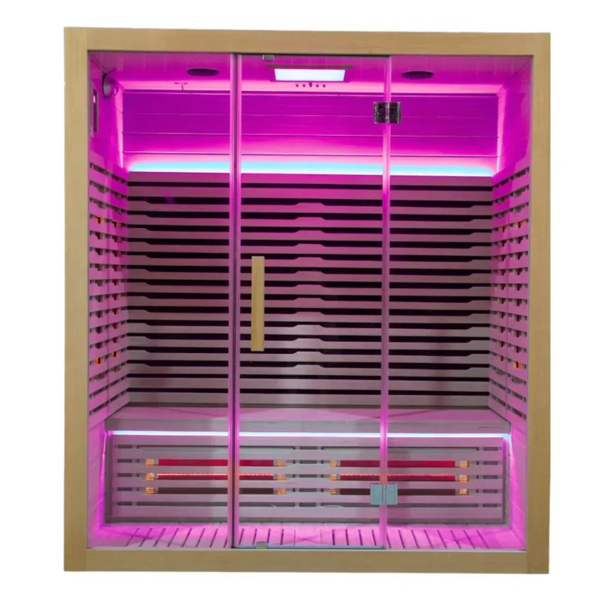 The Full Spectrum Sauna is designed with an 8 mm thick glass door, allowing natural light to illuminate the interior while providing an elegant and modern look. The cabinet lights are available in a variety of colors, creating a soothing and atmospheric atmosphere.