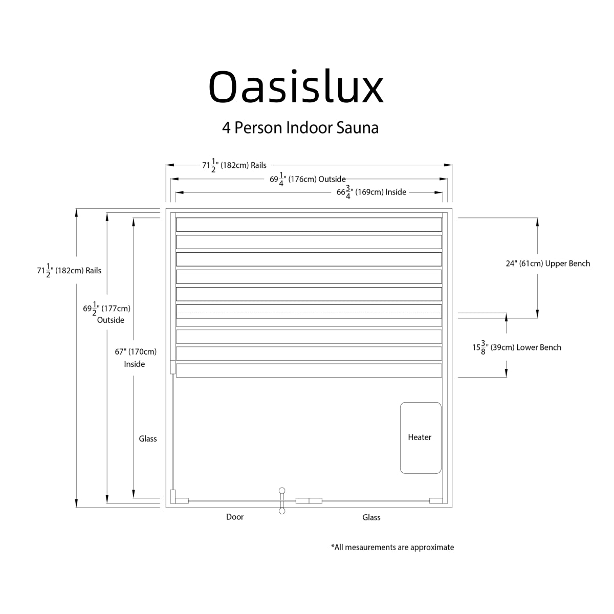 The Oasislux Indoor Cedar Sauna showcases exceptional craftsmanship, with precision-cut tongue-and-groove cedar panels and pre-assembled sections for easy setup. Made from certified Western Red Cedar, it offers durability, natural elegance, and a warm aroma. This handcrafted sauna combines functionality with timeless beauty, enhancing any space with its sleek design and flawless finish.
