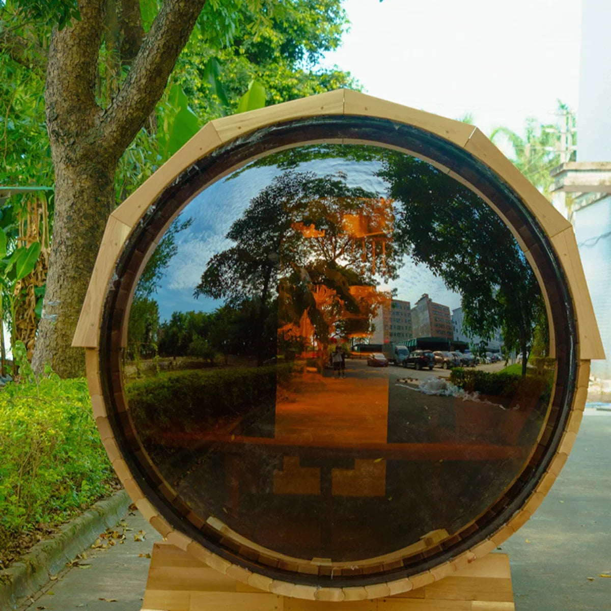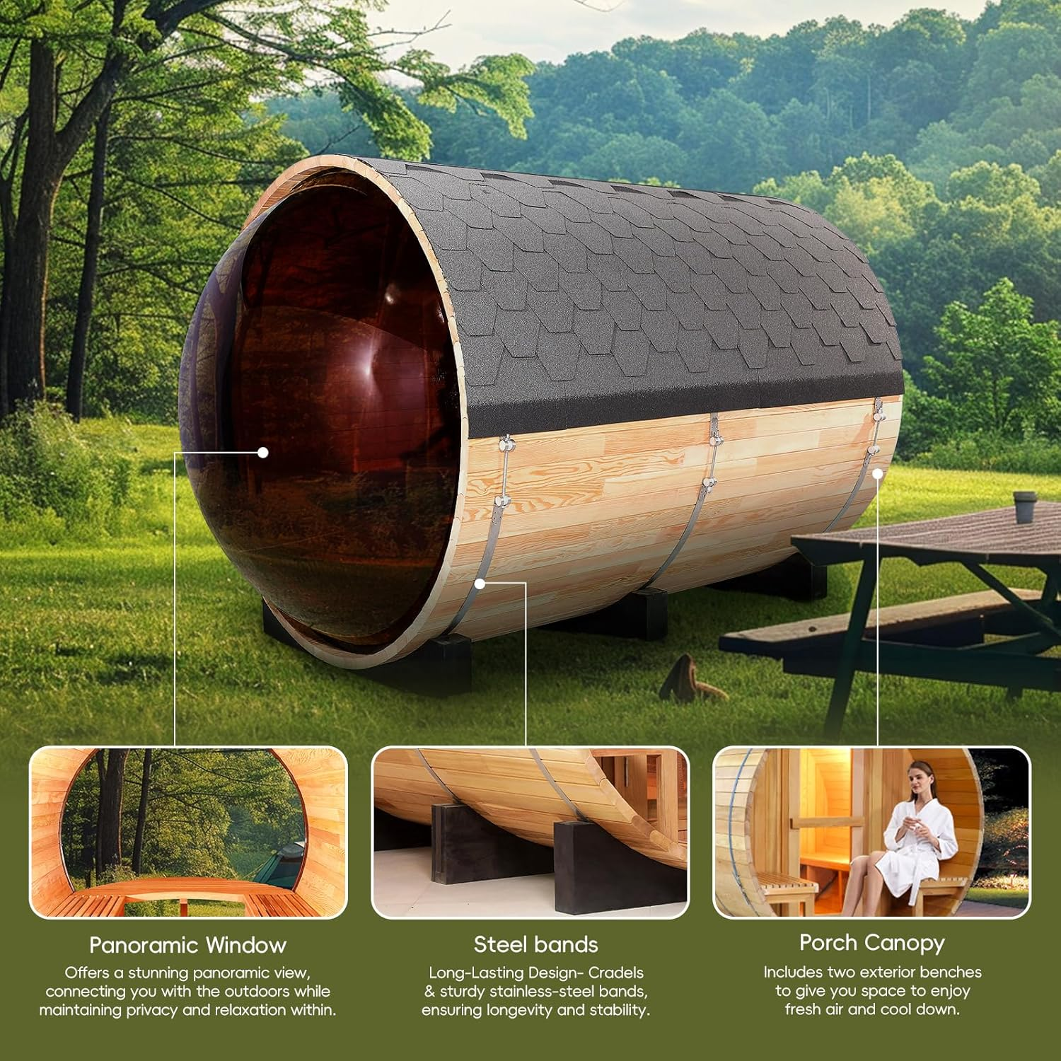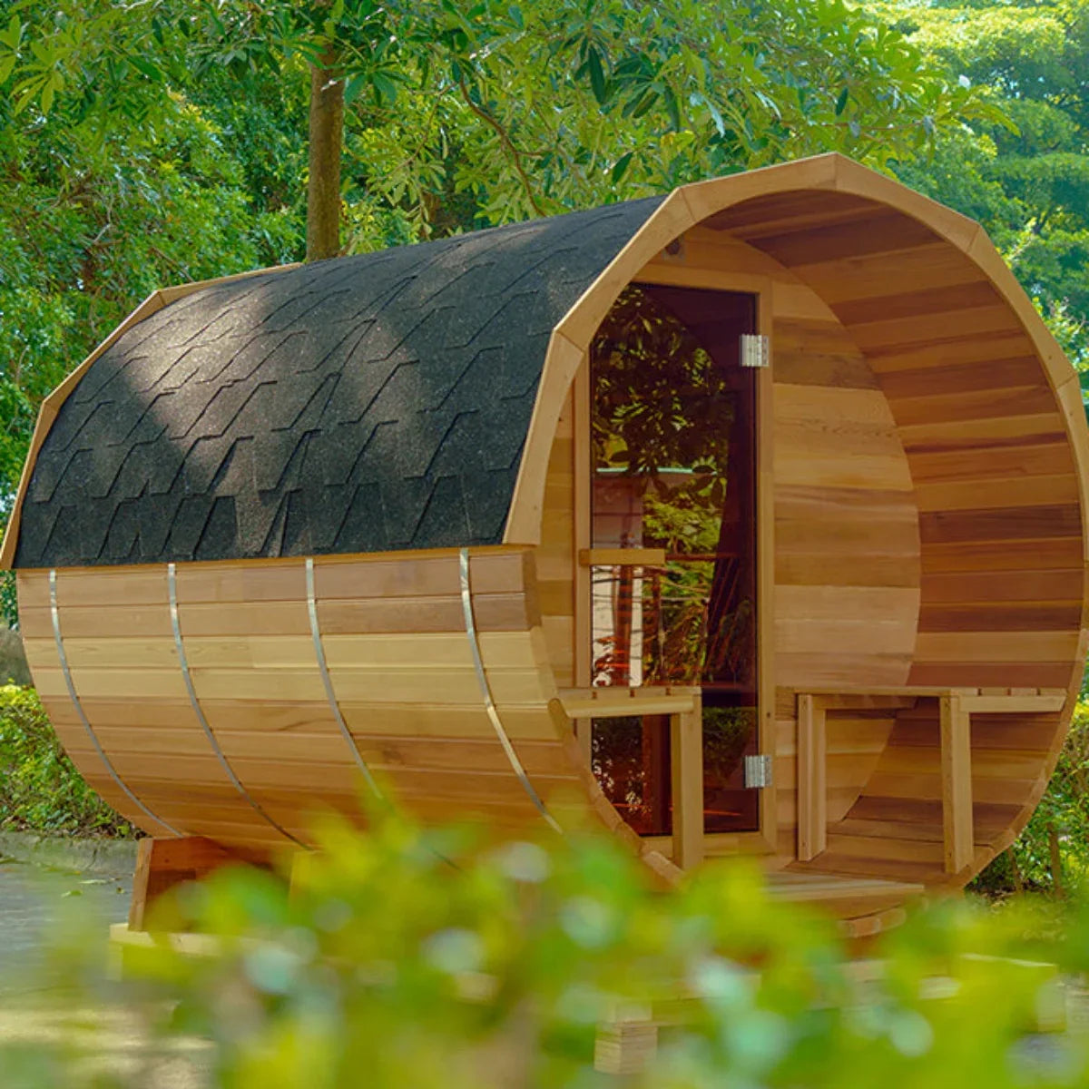 Experience the ultimate blend of luxury and nature, the OasisLux Cedar Barrel Panoramic Sauna allows you to immerse yourself in the beauty of nature while enjoying a sauna.