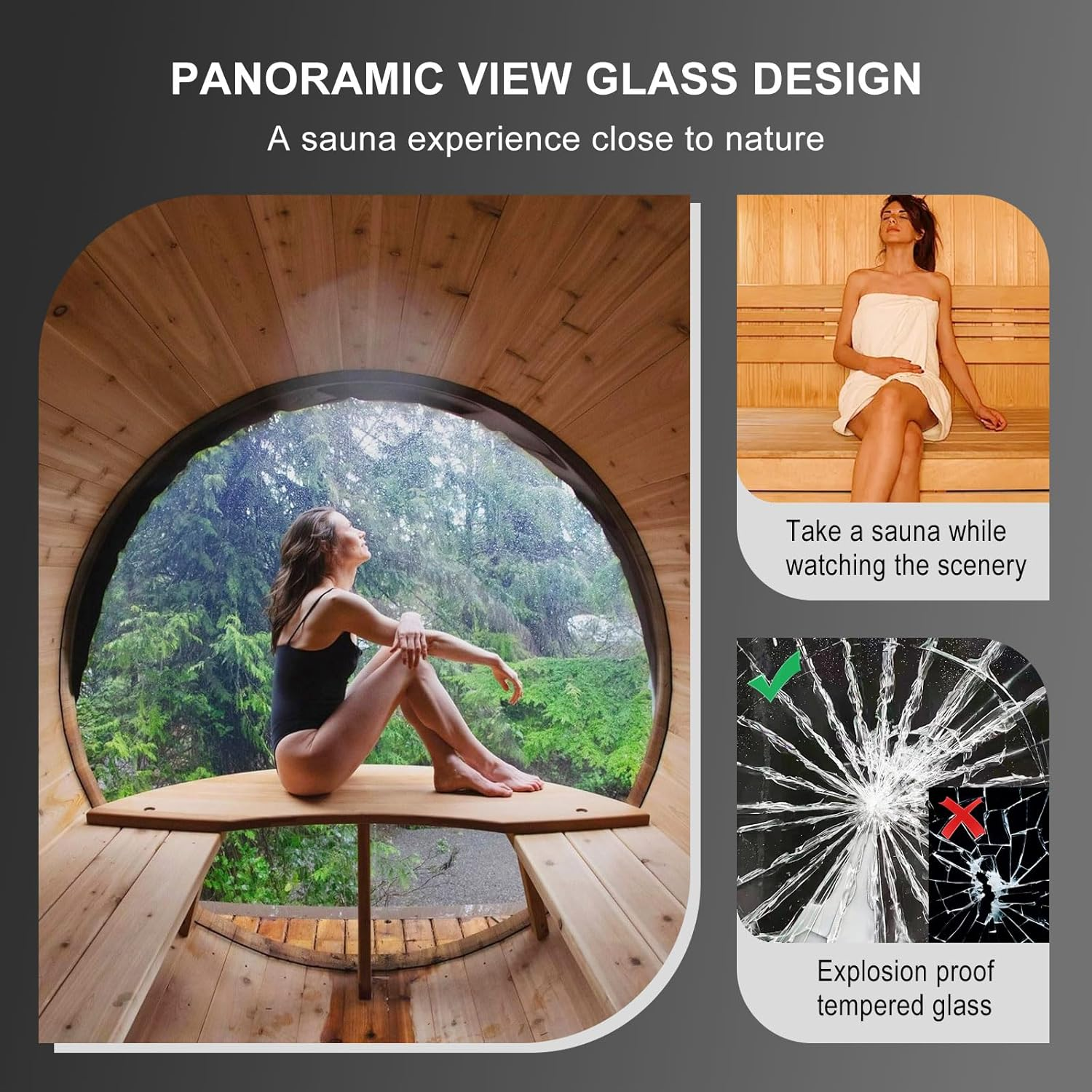 Made of carefully selected wood, this panoramic sauna not only exudes natural fragrance, but also has excellent weather resistance, suitable for a variety of outdoor environments.